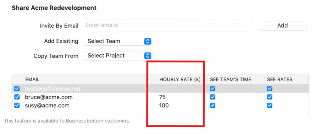 Simply make a new project (New—> Project menu) or edit an existing project (Edit—>Projects menu). Then click Add Team Members. Enter in the email of the person you want to share with or select an existing shared project to share out to that same team. You can enter multiple emails at once. If they already have OfficeTime, the project will appear in their copy. If they don’t, they’ll be invited by email to create an account and download.