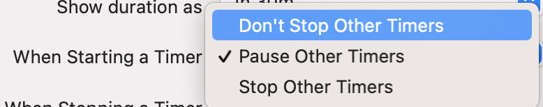 By default OfficeTime stops one timer when you start another which is handy. You can run multiple timers at once: